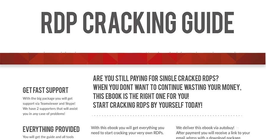 Are you still paying for single cracked rdps?No more .Download this RDP cracking guide and dont waste your money.Start cracking RDPS by yourself today.This ebook will get you everything that you need to start cracking your own RDP’s.You will be provided with tools,Guide and much more to automate the process of cracking the RDP’s.Wait no more and start cracking now.